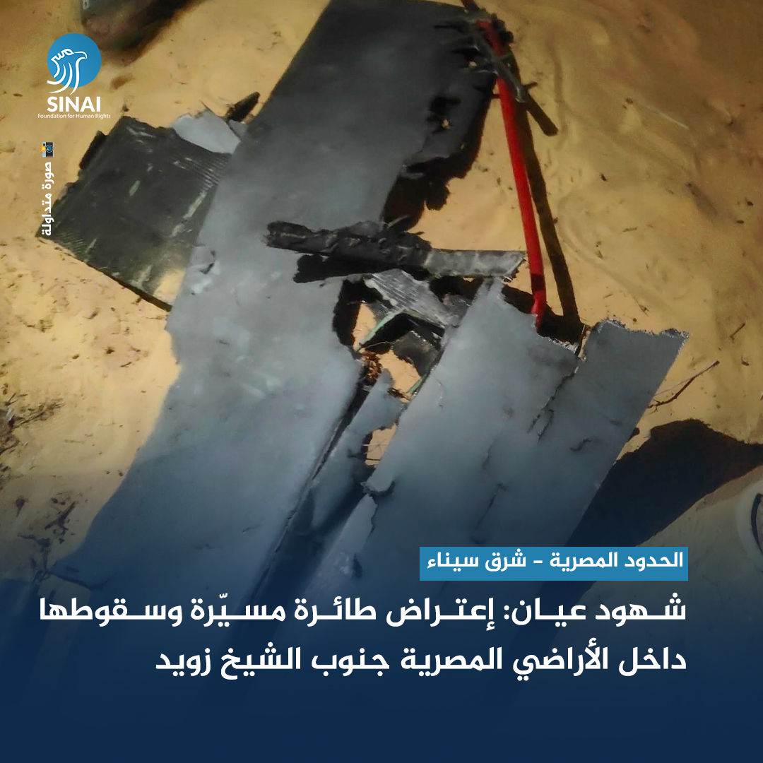 أفاد شهود عيان لـ«مؤسسة سيناء لحقوق الإنسان» بسقوط طائرة مسيّرة داخل الأراضي المصرية جنوب مدينة الشيخ زويد بشمال سيناء، مساء الأربعاء 8 أكتوبر 2025، يُرجّح أنها تعود لجماعة أنصار الله (الحوثيين)، بعد اعتراضها في أجواء قريبة من الحدود المصرية شرق سيناء.