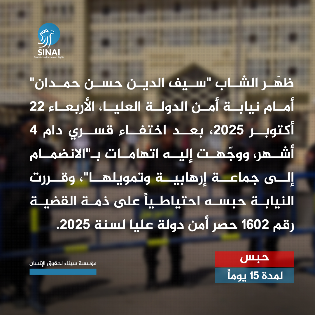 ظهر في نيابة أمن الدولة العليا أمس الأربعاء، 22 أكتوبر 2025، "سيف الدين حسن حمدان"، البالغ من العمر 23 عامًا، والمقيم في حي أبو فرج بمدينة الشيخ زويد في محافظة شمال سيناء، وذلك بعد فترة اختفاء قسري استمرت أربعة أشهر.