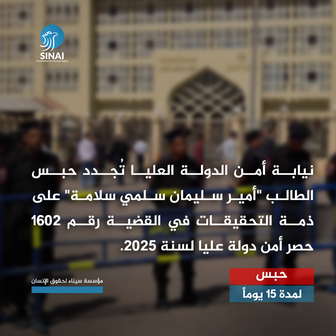 أفادت مصادر لمؤسسة سيناء لحقوق الإنسان بأن نيابة أمن الدولة العليا قررت، اليوم الاثنين 27 أكتوبر 2025، تجديد حبس "أمير سليمان سلمي سلامة" لمدة 15 يومًا على ذمة التحقيقات في القضية رقم 1602 لسنة 2025.