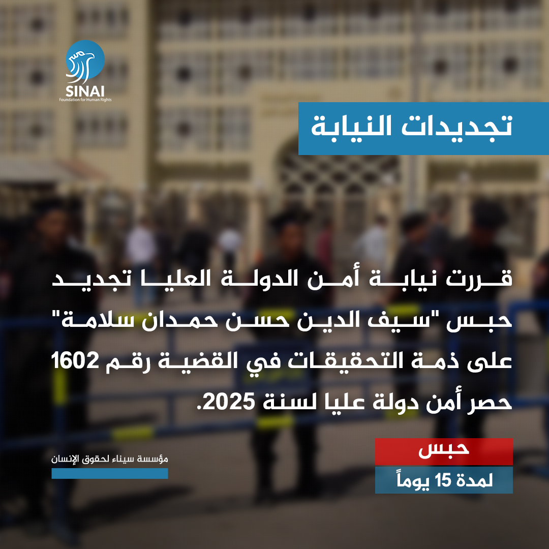 أفادت مصادر لمؤسسة سيناء لحقوق الإنسان بأن نيابة أمن الدولة العليا قررت اليوم الأحد 2 نوفمبر 2025، تجديد حبس "سيف الدين حسن حمدان سلامة" لمدة 15 يومًا على ذمة القضية رقم 1602 حصر أمن دولة عليا لسنة 2025.