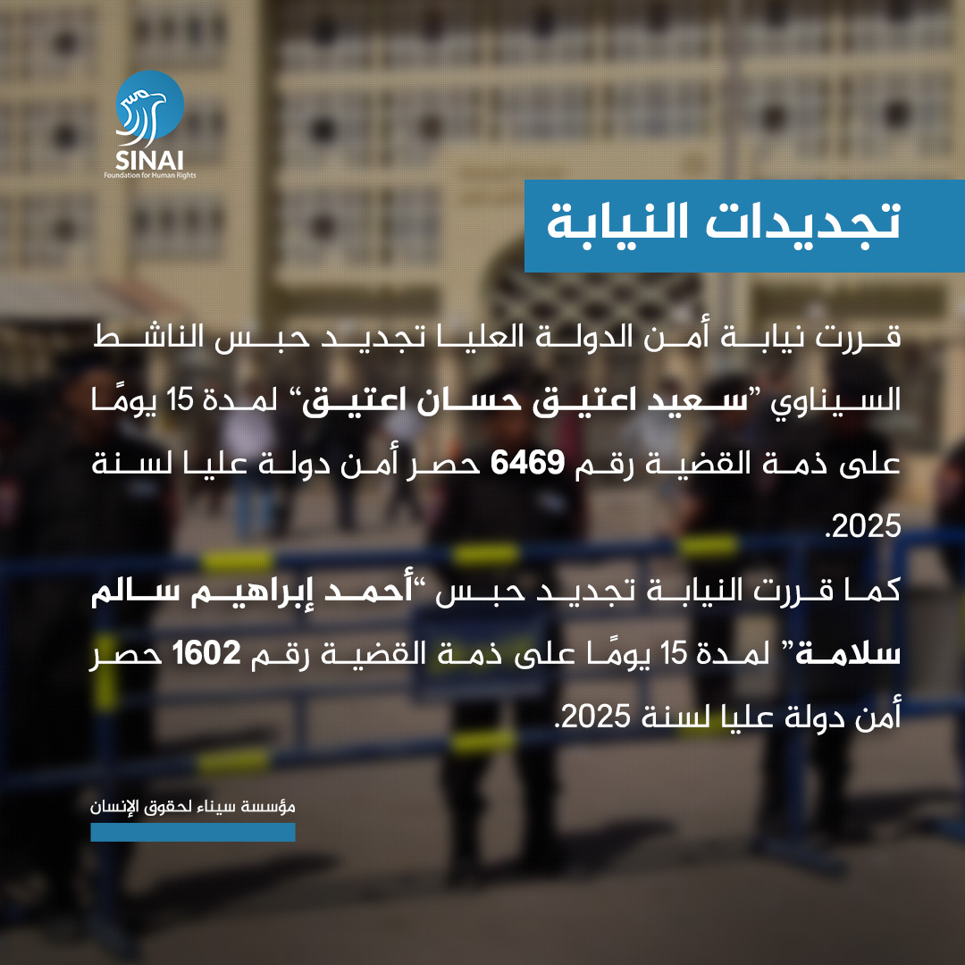 قررت نيابة أمن الدولة العليا، اليوم الاثنين 17 نوفمبر 2025، تجديد حبس الناشط السيناوي "سعيد اعتيق حسان اعتيق" لمدة 15 يومًا على ذمة القضية رقم 6469 حصر أمن دولة عليا لسنة 2025.