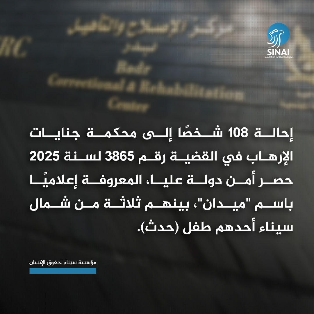 إحالة 108 شخصًا إلى الجنايات في قضية "ميدان – Maydan" بينهم ثلاثة من شمال سيناء أحدهم طفل (حدث)