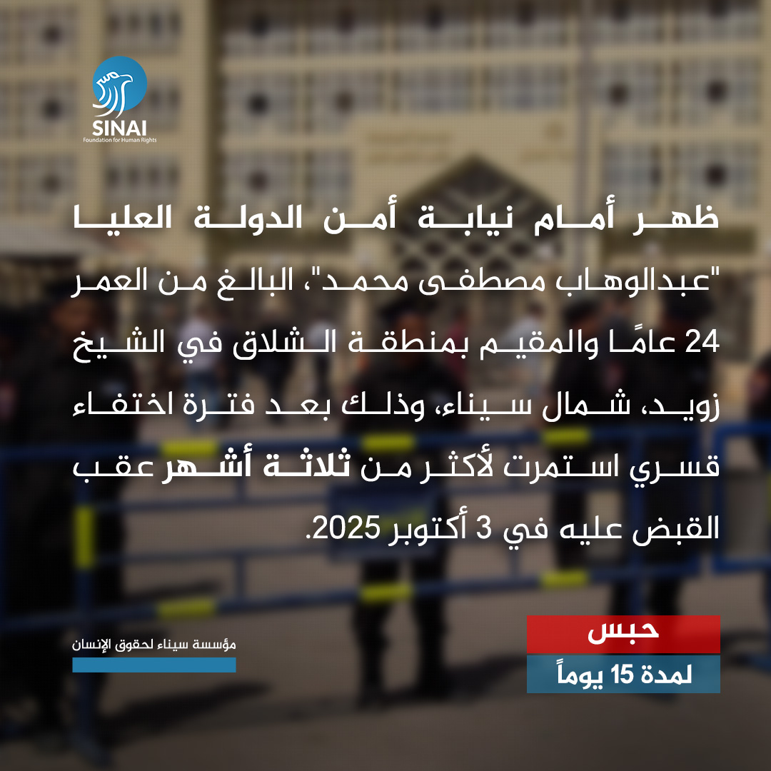 وكان "عبد الوهاب" قد أُلقي القبض عليه في 3 أكتوبر 2025، حيث انقطع التواصل معه بصورة كاملة منذ ذلك التاريخ، وظل محتجزًا داخل مقر الأمن الوطني بالعريش طيلة فترة اختفائه.